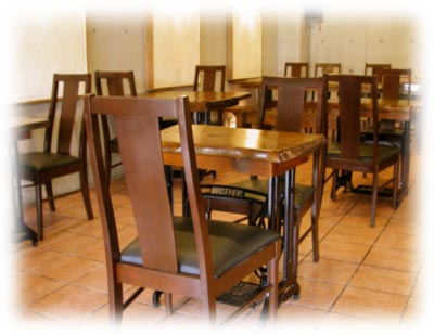 | 入り口を入ってすぐ右側、珈琲豆とガラス越しに焙煎機が見えます。 | テーブルは古いミシンを利用したもの。テーブルの間隔をたっぷり取ってあるので、落ち着いて召し上がれます。 |